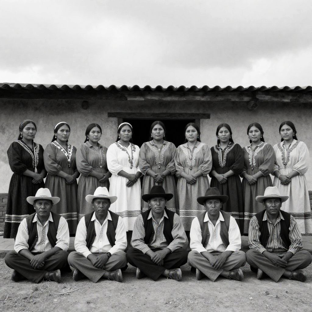 Photograph of five Indigenous people carrying a large animal carcass. Three women and two men, dressed in brown clothing, stand in a golden field with a forested background. Central blonde woman with pink shirt, white pants, supports the carcass. Four others hold it up. Forested hill in background. Intense expressions on faces.