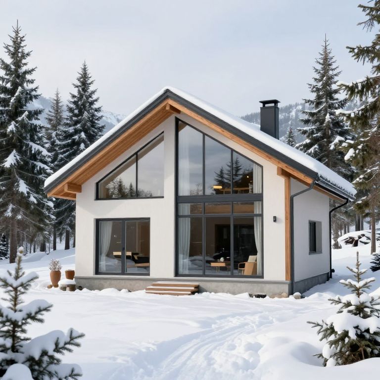 Cozy master bedroom at Chalet Sirocco in Verbier, featuring a wooden ceiling with exposed beams, a plush gray bed with white linens and a brown throw, flanked by two bedside lamps, a framed winter landscape above the headboard, and sliding glass doors leading to a balcony overlooking snow-covered mountains.