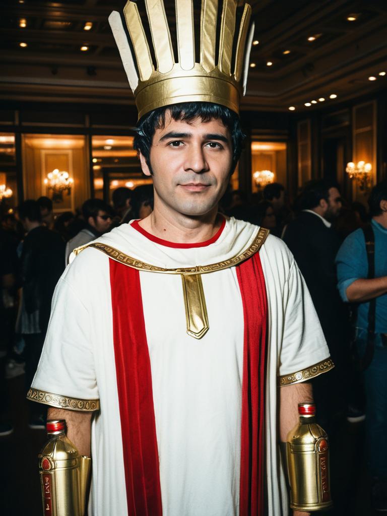 Portrait of a man wearing a Caesar dressing bottle costume at a themed event. The costume is white with red vertical stripes and gold decorative accents, featuring a tall gold crown resembling the dressing bottle cap and gold bottle details on the sleeves. The setting is indoors with dim lighting and a crowd of people in the background.