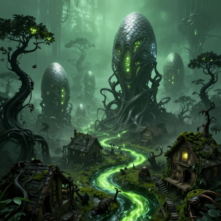 The image depicts a dark, grungy, and unsettling scene of a concrete sewage aqueduct, with a filthy, unsanitary appearance. The aqueduct is filled with toxic, bubbling green liquid, creating an eerie and nauseating atmosphere. The aqueduct's walls are covered in moss and grime, adding to the overall sense of decay and neglect. A large, ornate pipe, adorned with intricate golden designs, hangs above the aqueduct, casting a shadow over the scene. The aqueduct is flanked by rows of stone columns, which appear to be decaying and covered in moss. The overall composition is highly detailed, with a focus on the interplay of textures and colors, creating a sense of depth and realism. The image is a hyperdetailed masterpiece, with a dark, horror-like aesthetic, reminiscent of the works of artists like Gustave Dore and Tom Bagshaw. The scene is set in a nightmare-like environment, with a high contrast and a Seed value of 23760, making it a trending piece on CGSociety. The image is an 8k artwork, with a golden ratio composition, further enhancing its visual appeal.