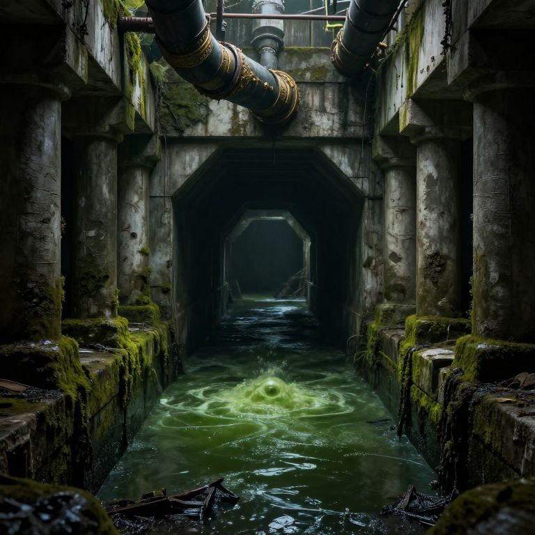 Dark Mossy Sewage Aqueduct with Bubbling Toxic Water