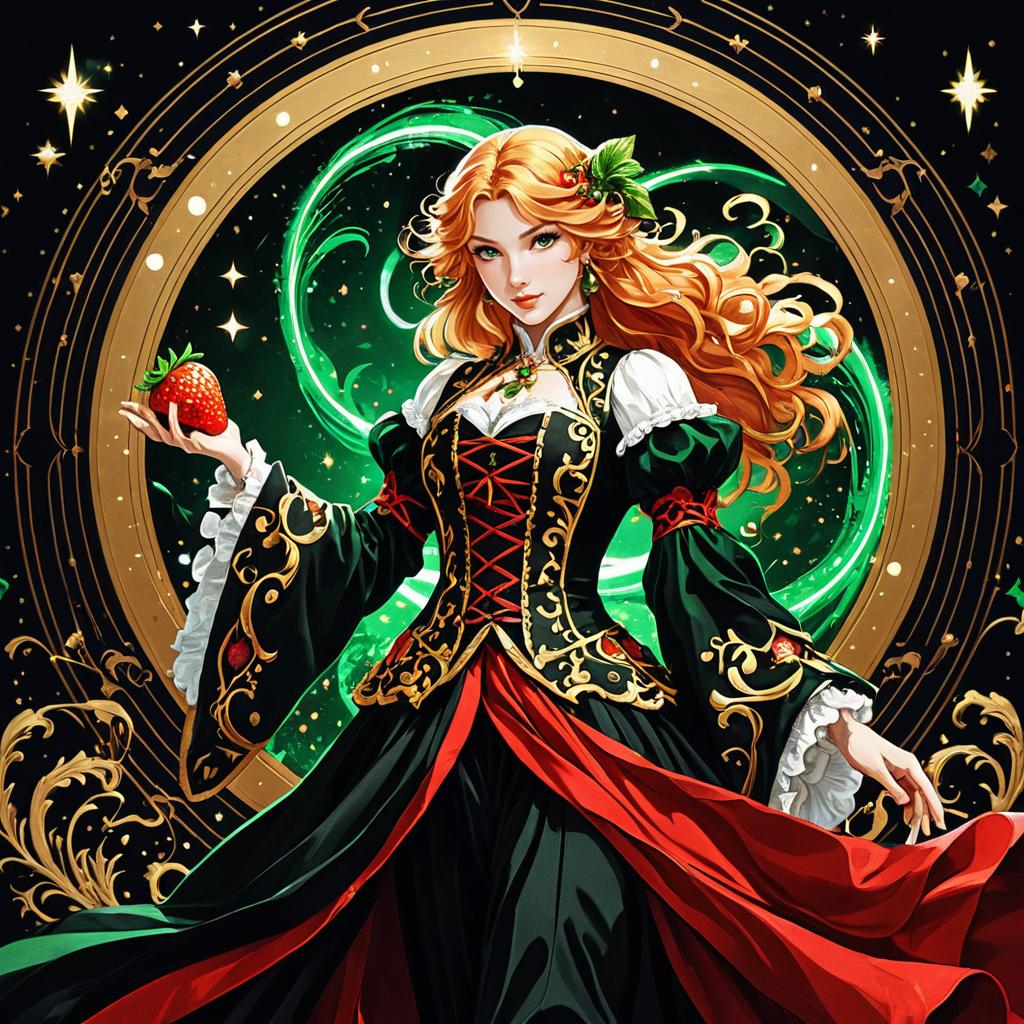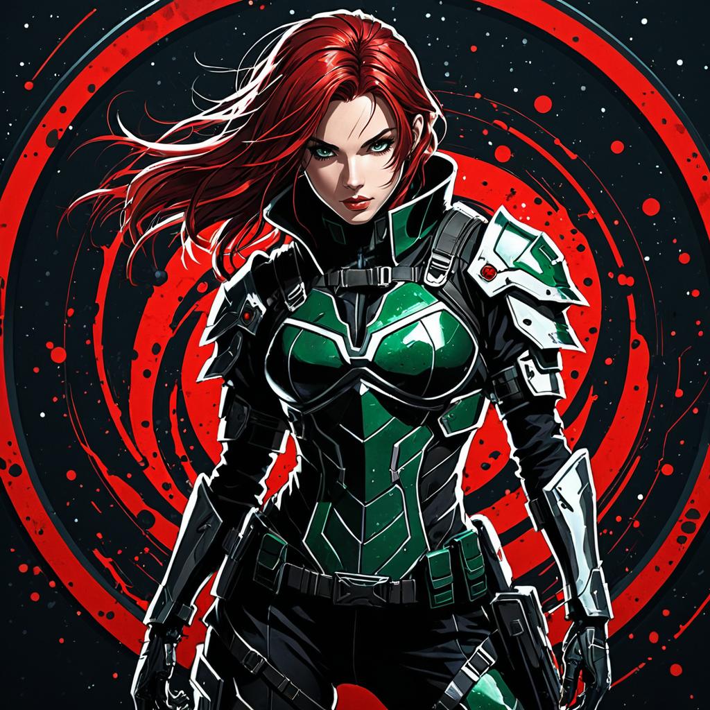 A striking digital anime-style artwork featuring a nimble mage with emerald green eyes and wavy chestnut hair, dressed in an illuminated silk robe with golden threads and intricate embroidery. She is surrounded by swirling liquid-like red and black abstract elements forming a dynamic circular motion around her. Dramatic lighting highlights her delicate pose and sharp features, with high contrast between the dark background and vivid red highlights. Sparkling accents resembling stars add to the elegant and slightly mysterious atmosphere. The piece features intricate details on clothing and accessories, highly detailed rendering, crisp lines, and a vibrant color palette with emphasis on reds, blacks, and whites.