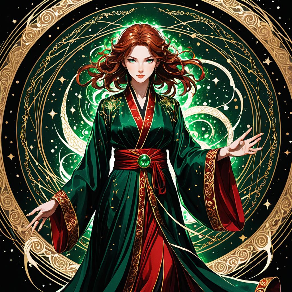 Digital anime-style artwork of a nimble female mage with emerald green eyes and wavy chestnut hair. She wears an illuminated green silk robe adorned with gold embroidery and a red sash with a green gem. Surrounded by swirling golden magical circles and star-like accents, set against a dark background, the image emphasizes dramatic lighting, dynamic motion, and intricate details.