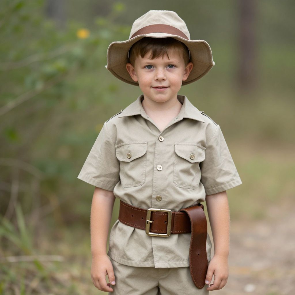 Safari Kid Costume, boy in safari outfit with hat and leather belt posing for picture