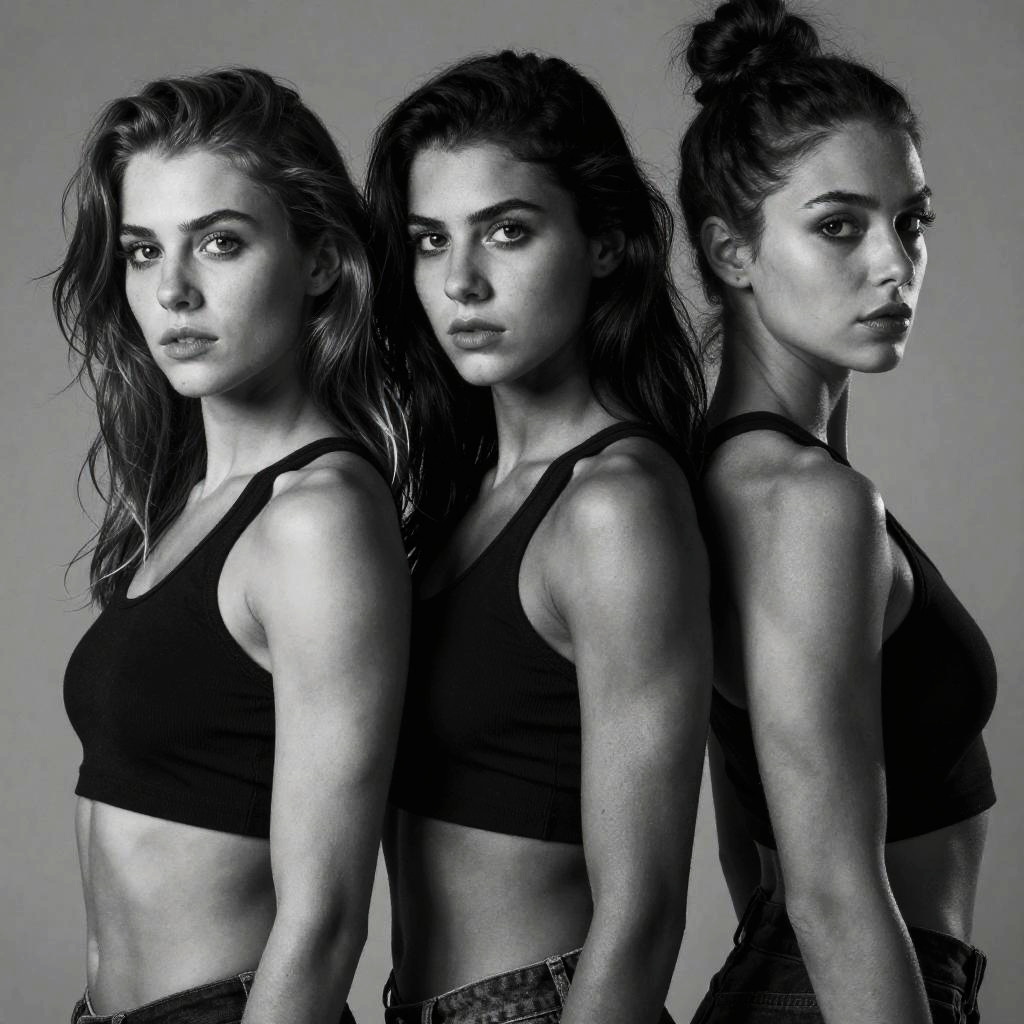 Girls with muscle in artistic black and white portrait style, dramatic shadows emphasizing muscle tone and structure, intense gaze, cinematic lighting, fine detail realistic skin textures