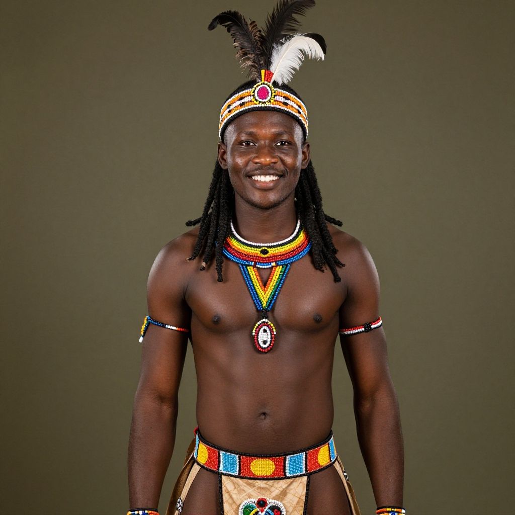 Photograph of a smiling, muscular, dark-skinned African man with long black dreadlocks wearing traditional tribal attire. He has a black and white feather headdress, colorful beaded necklace, arm bands, and a loincloth with multicolored patterns. His chest is bare, revealing a fit physique. The background is a plain, solid dark green, highlighting his vibrant clothing and accessories. His eyes are bright, and his expression is joyful. The image has a high-contrast, vivid color palette, emphasizing cultural elements and traditional adornments.
