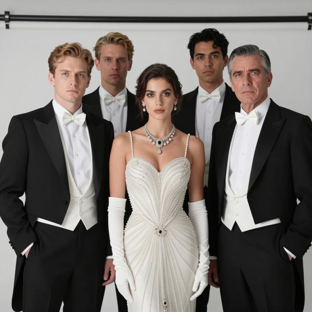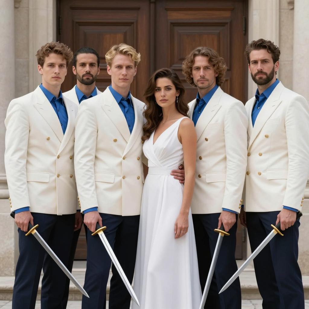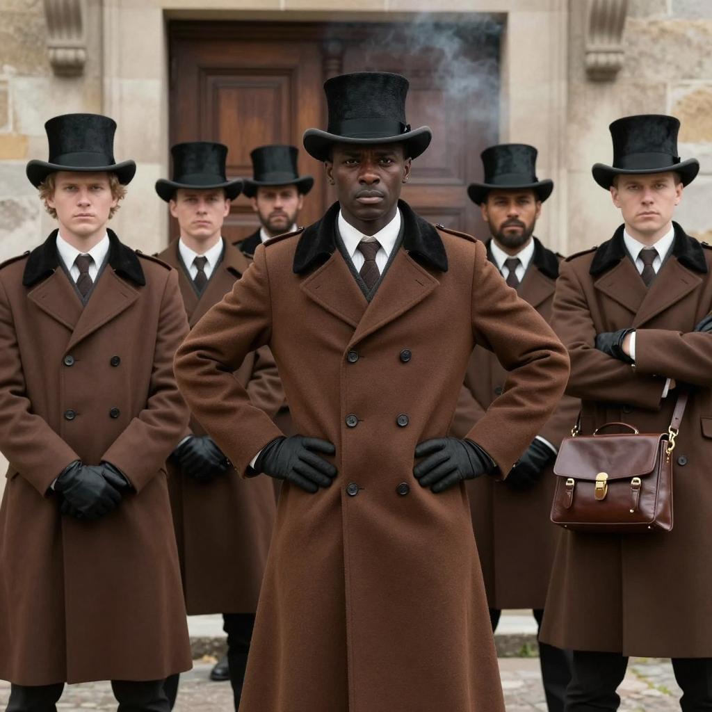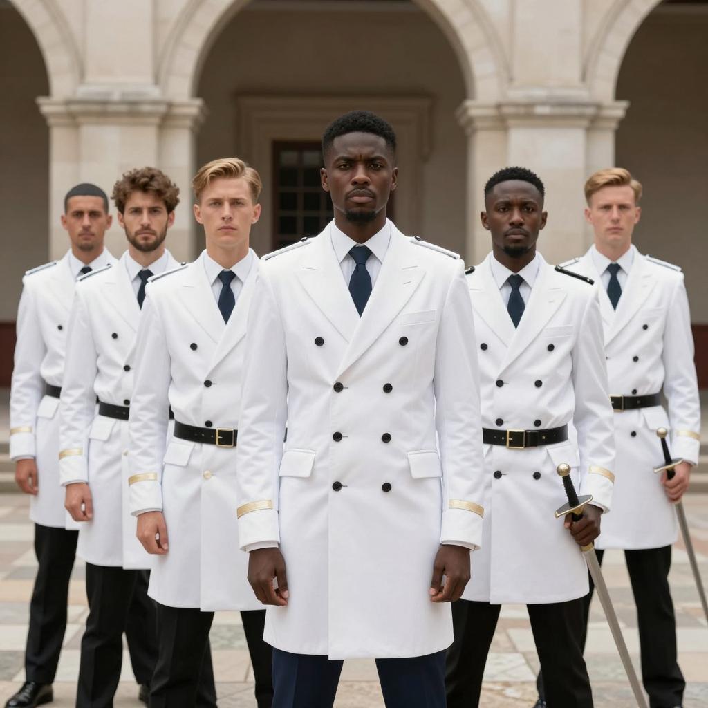 Group of seven men standing in a courtyard. Central man is Black with short hair, white double-breasted coat, blue pants. Six white men with similar coats, black belts, black pants. Background: stone wall, archway, metal window. Man on far right holds a sword. Men's expressions are serious. All men have neat hair, clean-shaven.