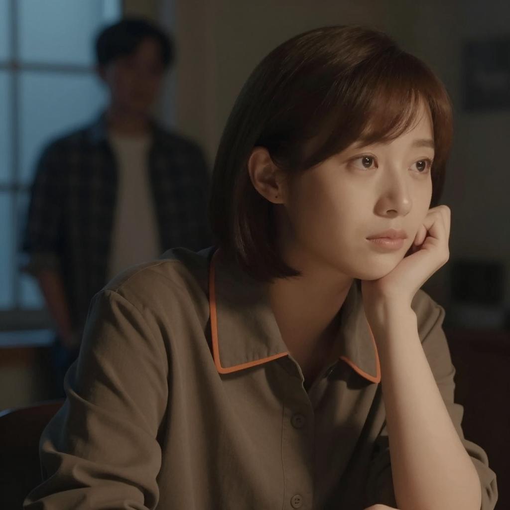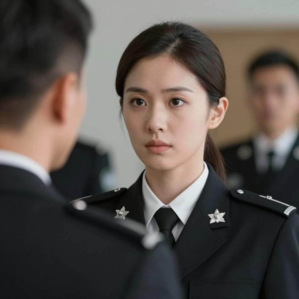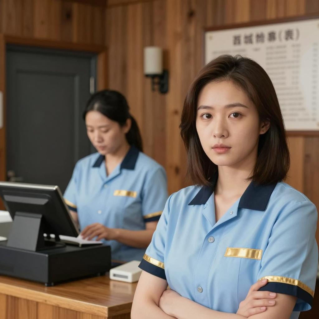Photograph of two women in a wooden-walled room. Foreground woman with shoulder-length brown hair, light blue uniform, black and gold sleeves, looking straight ahead. Background woman with dark hair, light blue uniform, writing in a cash register. Wooden wall, black door, wall sconce, and menu board visible. Foreground woman's arms crossed, background woman's face not visible. Two people.