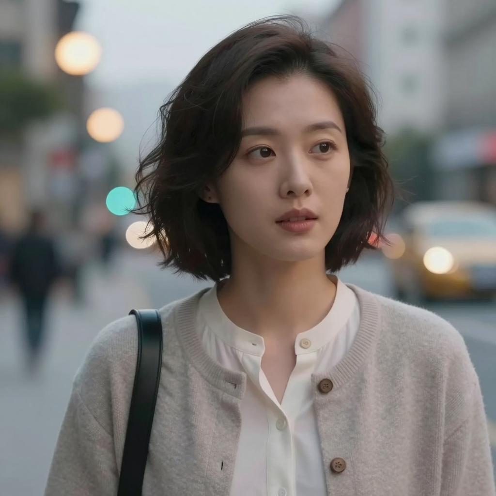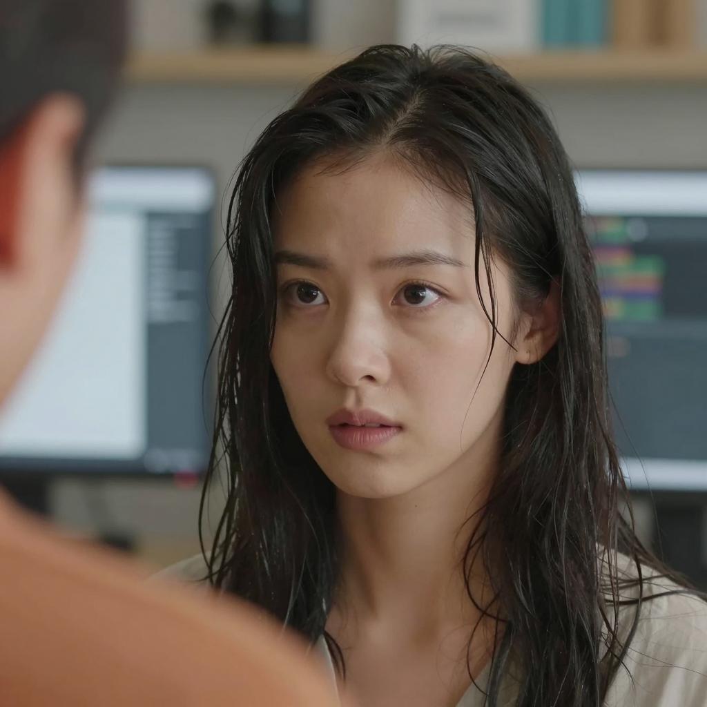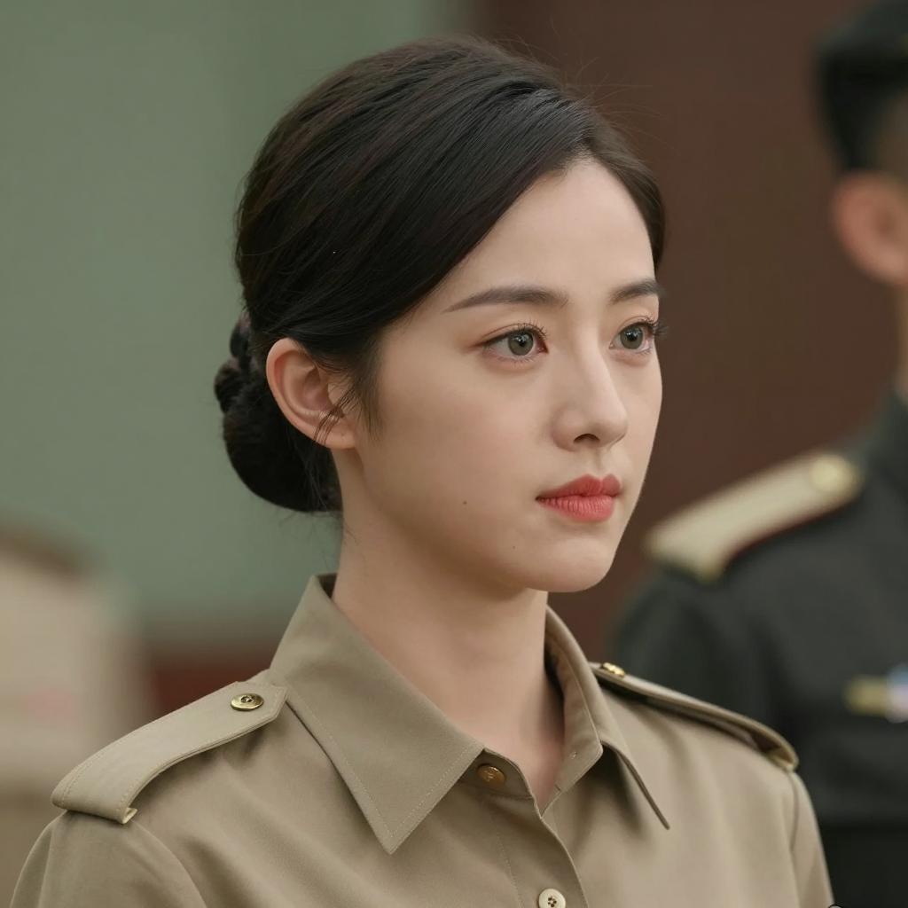 Photograph of two women in a wooden-walled room. Foreground woman with shoulder-length brown hair, light blue uniform, black and gold sleeves, looking straight ahead. Background woman with dark hair, light blue uniform, writing in a cash register. Wooden wall, black door, wall sconce, and menu board visible. Foreground woman's arms crossed, background woman's face not visible. Two people.