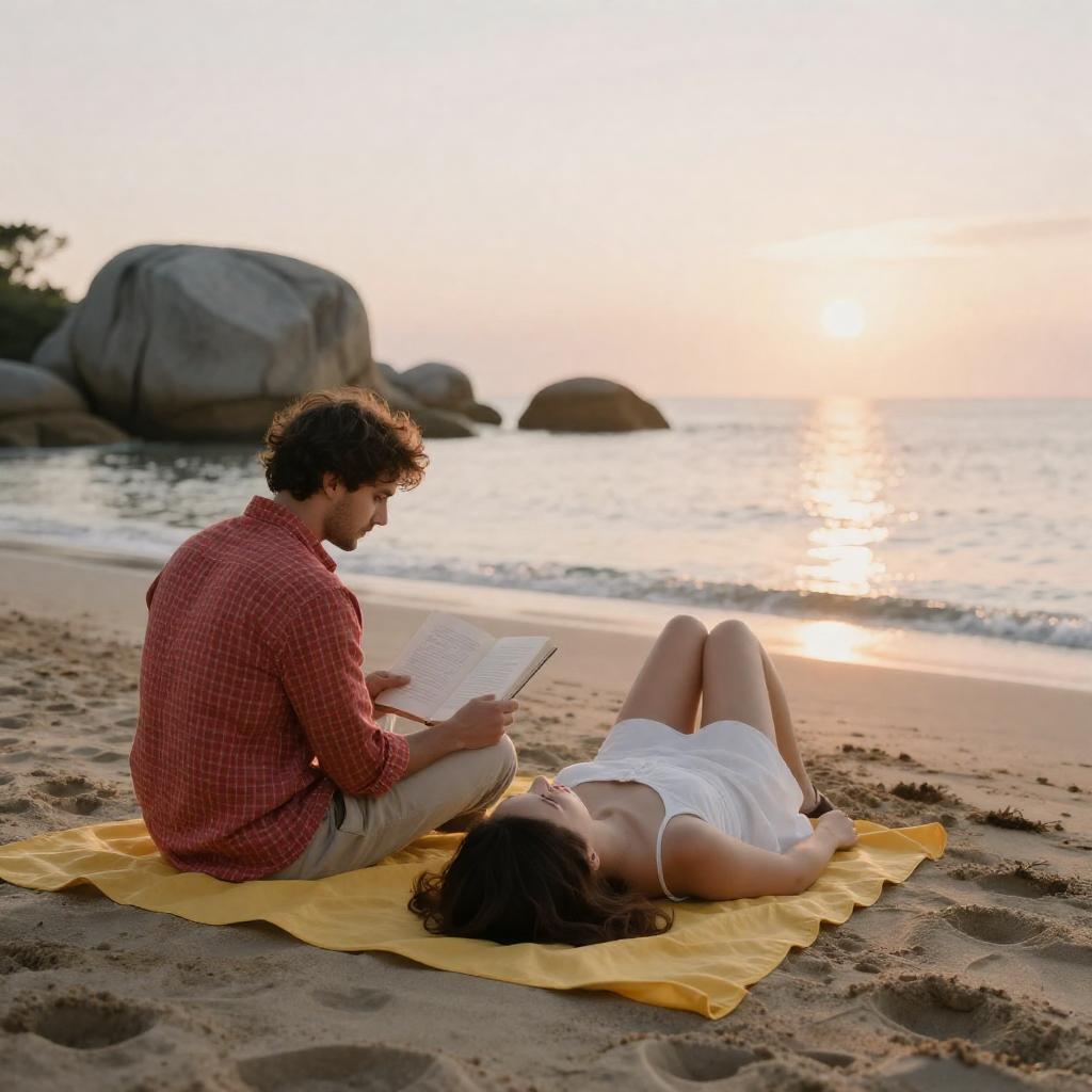 A photograph of a couple on a sandy beach. The man, in a red checkered shirt, sits on a yellow blanket, reading to a woman in a white dress, who reclines with her legs up. Large rocks are in the calm ocean water behind them, with a bright sunset in the background.