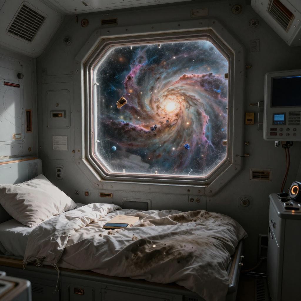 Hyperrealistic cinematic still photo a photo of a room with a bed and a window, photorealism, inside abandoned space ship, room of a spacecraft, looking out of window at space, nebula, masterpiece, best quality, (intricate details), dreamy, magnificent, ethereal, volumetric lighting, lightroom, ((cinematic)), raytracing, subsurface scattering, face focus
