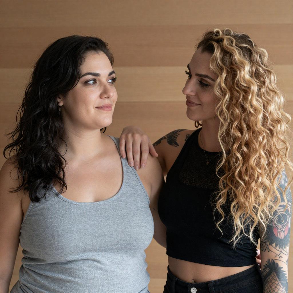 Photograph of two women standing in a wooden auditorium. Woman on left has long curly dark hair, yellow blouse, smiling at woman on right. Woman on right has short curly brown hair, green jacket, red and white top, smiling back. Both women looking at each other. Wooden seats in background.