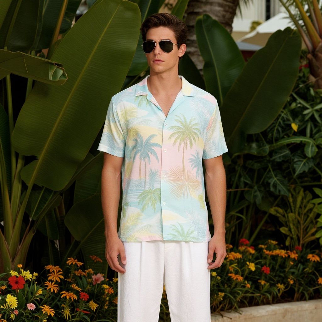 Tropical chic dress code male, fashionable male model in pastel tropical print short-sleeve shirt, relaxed white trousers, and aviator sunglasses, surrounded by lush exotic foliage and colorful flowers in a luxurious resort garden setting, soft shadows, summer mood