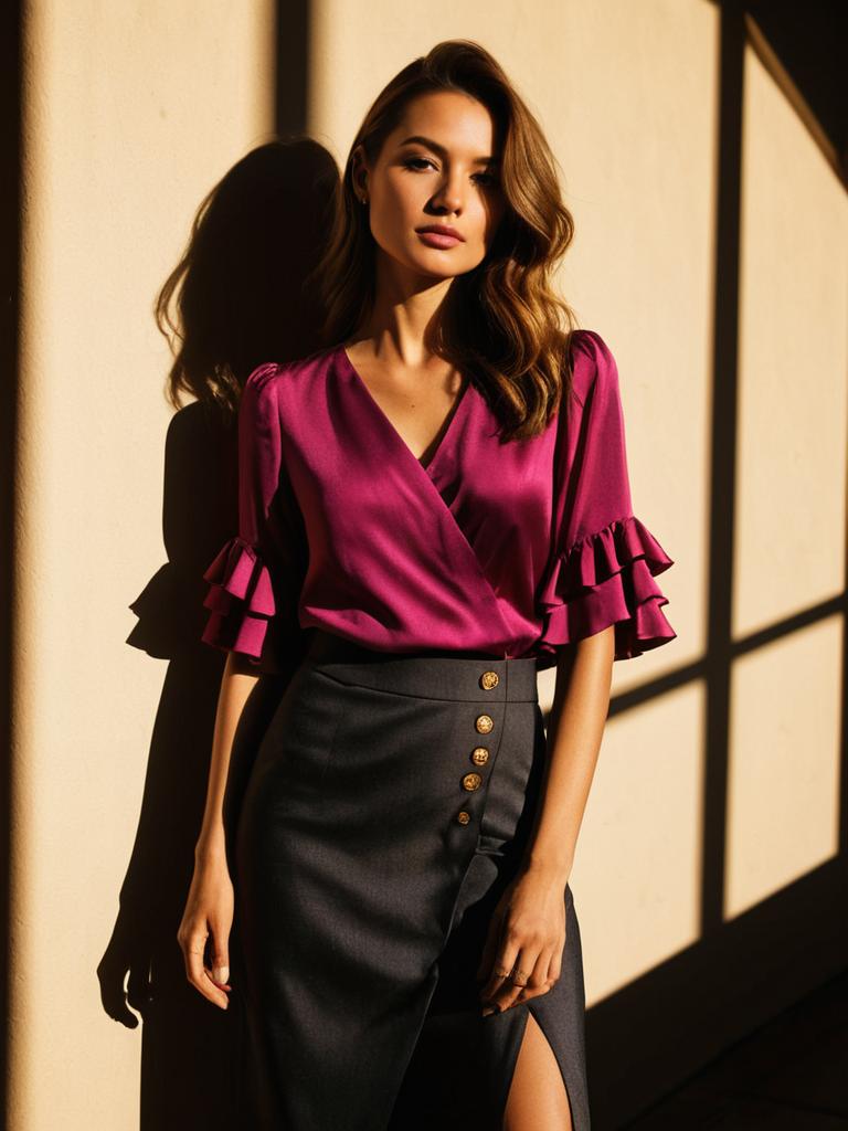 Portrait of a young woman wearing a contemporary outfit consisting of a fuchsia silk blouse with button details, three-quarter ruffled sleeves, and a scoop neckline paired with a charcoal gray wrap midi skirt featuring a slit. The studio background and dramatic lighting highlight the texture and elegance of the fabric.
