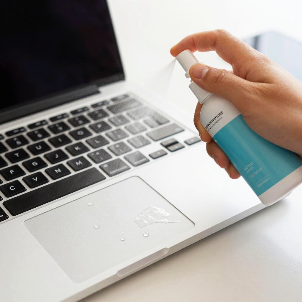 A hand holding a sticker remover spray, mist spraying over a stubborn sticker on a laptop cover, emphasis on the liquid droplets and sticker edges lifting, bright and clean workspace setting