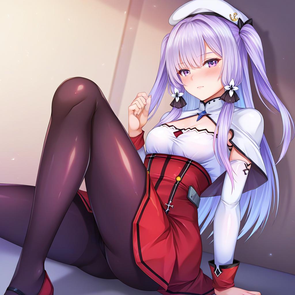 Ajax (azur lane), azur lane, 1girl, red eyes, purple eyes, long hair, purple hair, two side up, small breasts, white capelet, black pantyhose, red skirt, white headwear, detached sleeves, long sleeves, beret, by artist rebe11, illustrious
