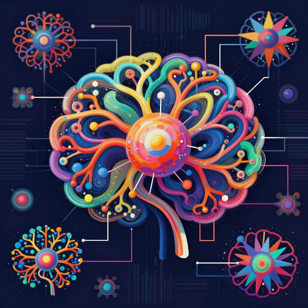 Dynamic scene of an ai clip art generator algorithm visualized through colorful algorithmic patterns, artificial neural networks, and digital brush strokes, blending artistic creativity with cutting-edge technology in a vibrant and energetic composition