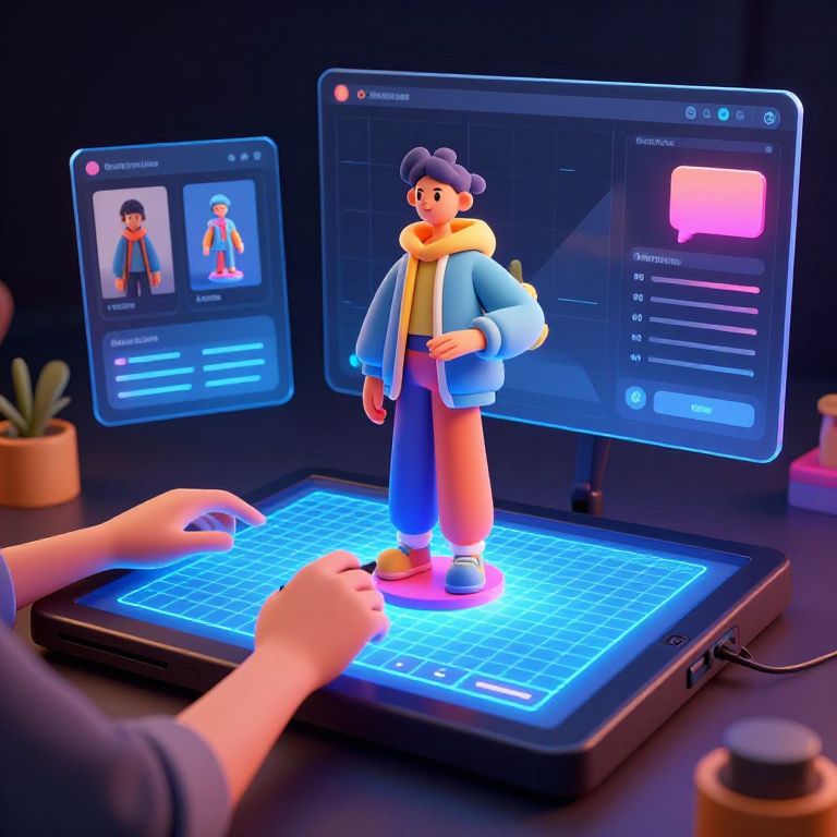 3d character maker online free, an imaginative scene of a creative artist sculpting vibrant 3D characters on a virtual touchscreen, floating UI panels with diverse customization options, glowing neon grids, high-tech and user-friendly design, cinematic soft shadows