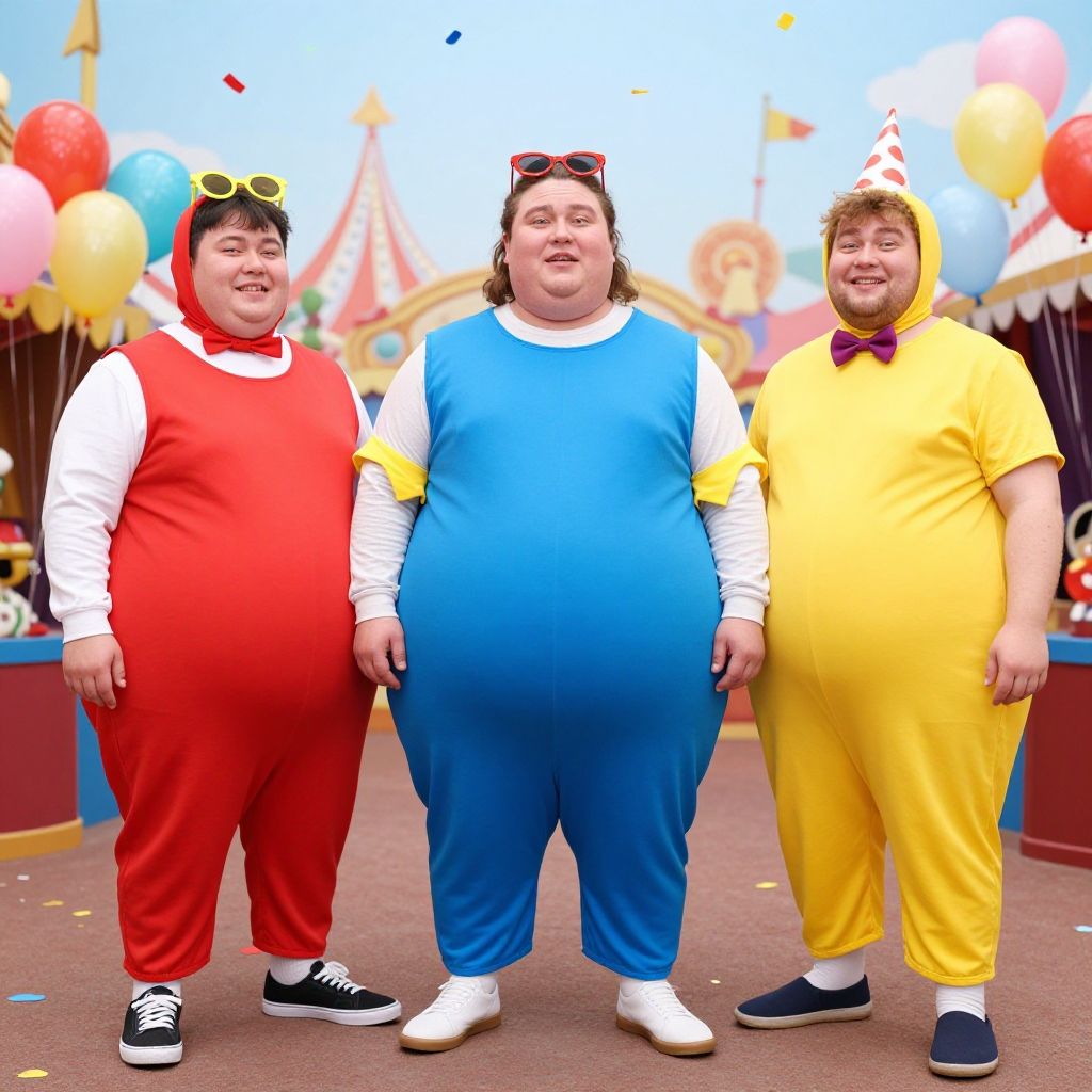 Funny costumes for fat guys featuring exaggerated cartoonish proportions, vibrant colors, and playful accessories, set against a whimsical carnival background with balloons and confetti, creating a cheerful and humorous atmosphere.