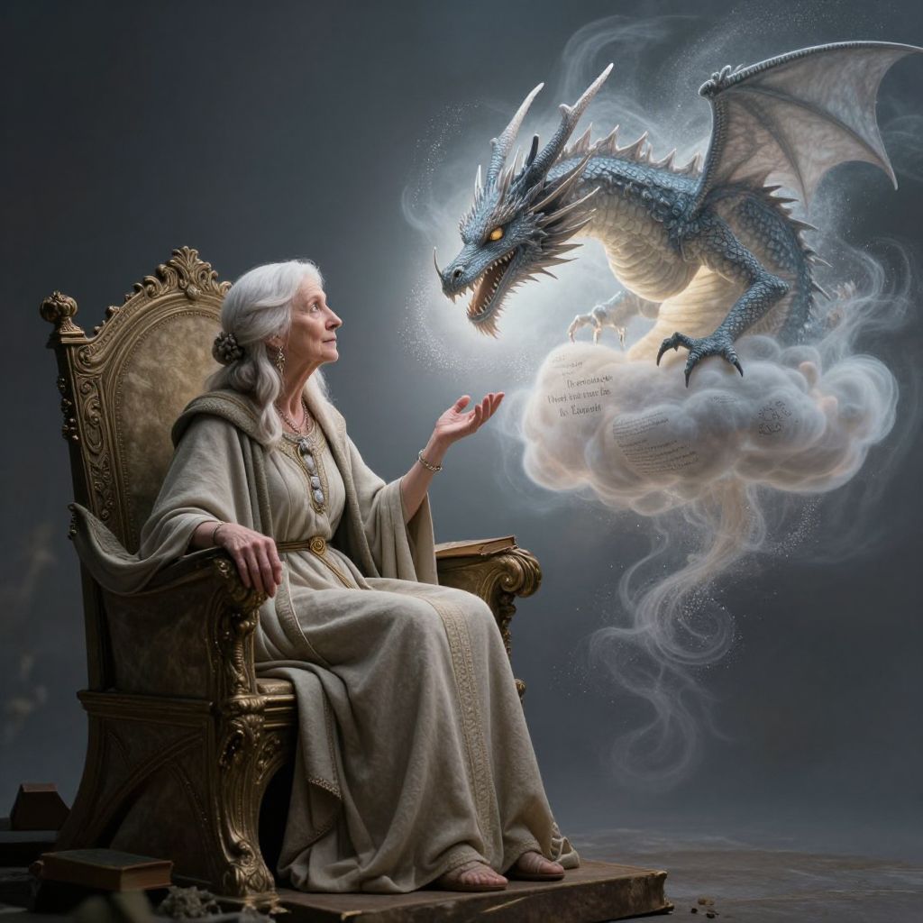 A digital illustration depicts an elderly white woman with long, white hair, wearing a flowing, beige robe, seated on an ornate, gold throne. Her right hand is raised, palm open, as a blue, ethereal dragon with glowing eyes and wings emerges from a cloud of mist to her left. The dragon's scales shimmer, and its mouth is open, emitting a bright, white light. The background is dark, highlighting the mystical interaction between the woman and the dragon. The image has a fantasy, magical realism style.