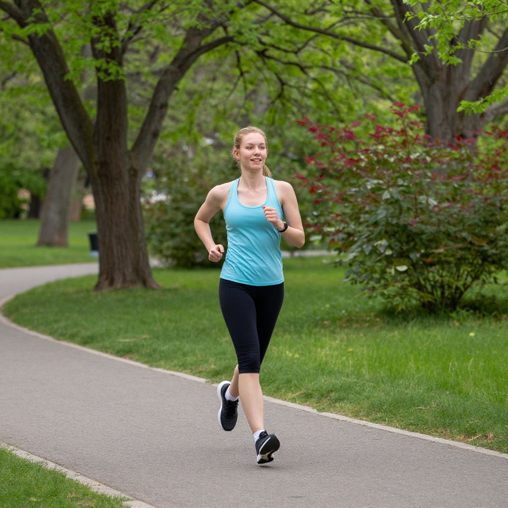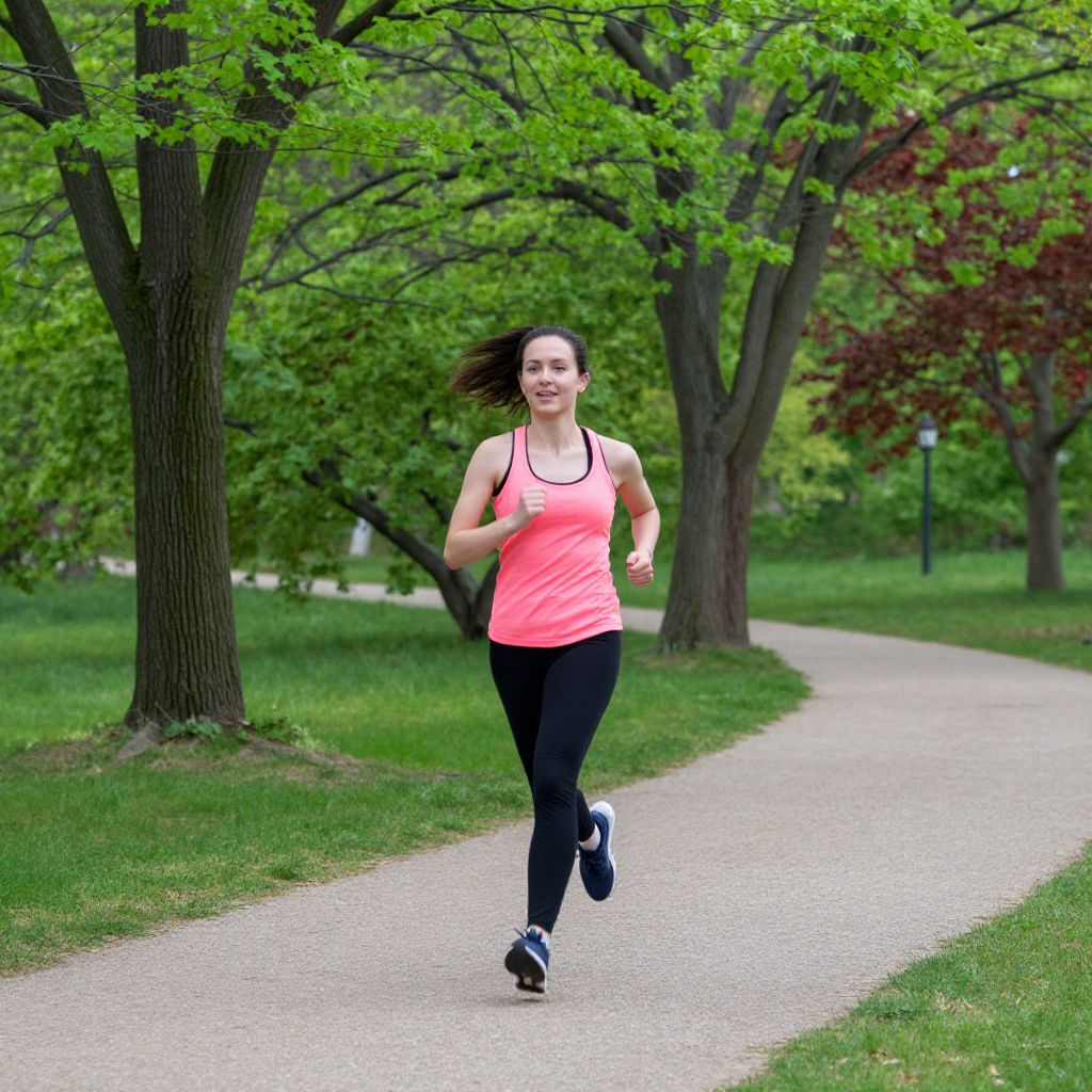 Woman jogging energetically along a serene park path, surrounded by lush green trees and vibrant foliage, exuding vitality and joy.
