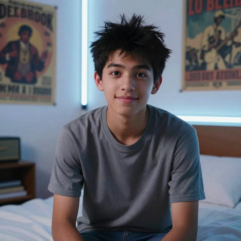 Photorealistic fashion editorial portrait of teenage boy with short jet black hair and bright smile, wearing bright red windbreaker and faded blue jeans, leaning against a railing in busy urban crosswalk with blurred pedestrian motion. Golden-hour warmth skims her skin; soft rim light shapes her silhouette; confident gaze meets the lens. Shallow depth of field, natural skin texture, fine fabric detail, tasteful color contrast, subtle film grain, high dynamic range, clean composition, professional finish.