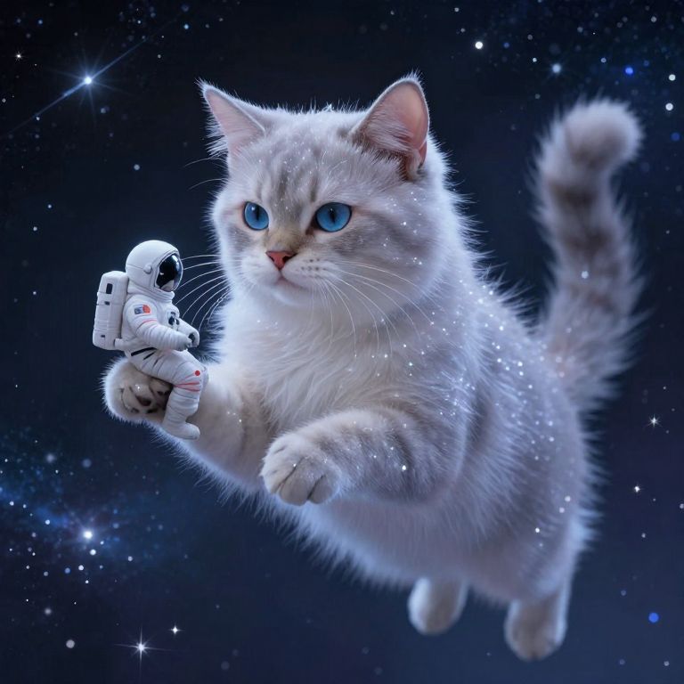 Photograph-like CGI of a fluffy white cat with bright blue eyes floating in a starry, deep-blue outer space background. The cat, with glowing white fur and sparkling highlights, holds a small white astronaut in its right paw. The astronaut, detailed with a helmet and gloves, contrasts with the cat's soft fur. The cat's tail is raised, and its left paw is extended forward, as if in mid-leap. The image combines realism and fantasy, creating a whimsical, otherworldly scene with a playful, adventurous atmosphere.