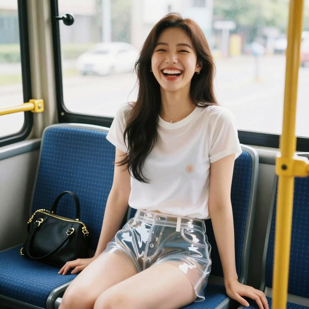 1girl, happy laugh, transparent shortpants with pussy, transparent shirt with nipple, necklace, jewelry, bag, sit chair in bus, the most beautiful image ever seen, realistic, uhd, RAW, sharp focus, photorealistic, best quality, korea, ultra high res