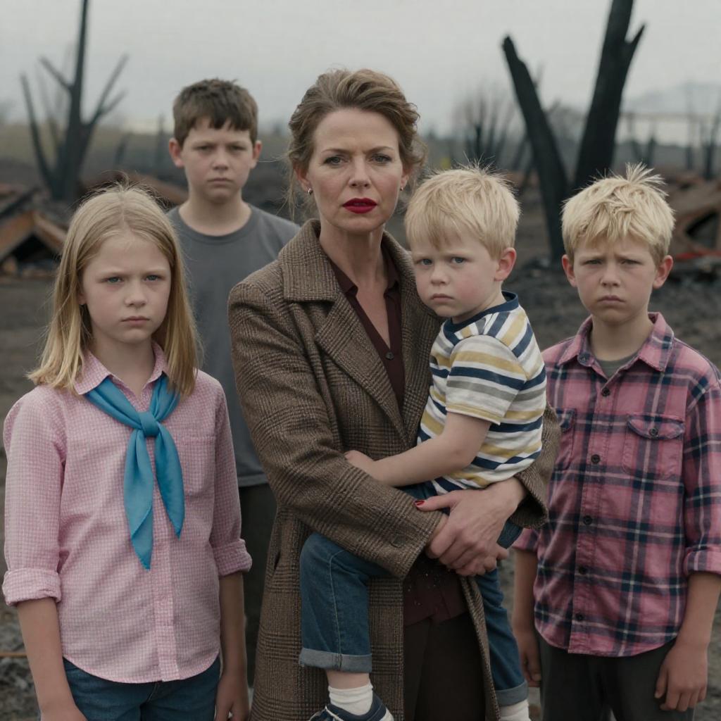 Photograph of five children in a post-apocalyptic setting. Central adult woman with red lipstick, brown plaid coat, and updo hairstyle, holding blonde boy with striped shirt. To her left, blonde girl in pink checkered shirt with blue scarf. To her right, blonde boy in pink plaid shirt, looking serious. Background boy in grey shirt, standing behind group. Ruined landscape with charred trees in background. Children have serious or neutral expressions.