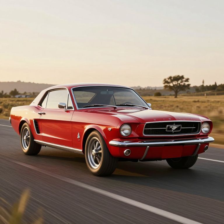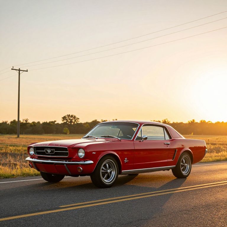 1969 cherry red Mustang parked on a sunlit vintage street, glossy paint reflecting the golden hour, classic muscle car details with chrome trim and iconic front grille, evoking nostalgic Americana vibe, photorealistic style