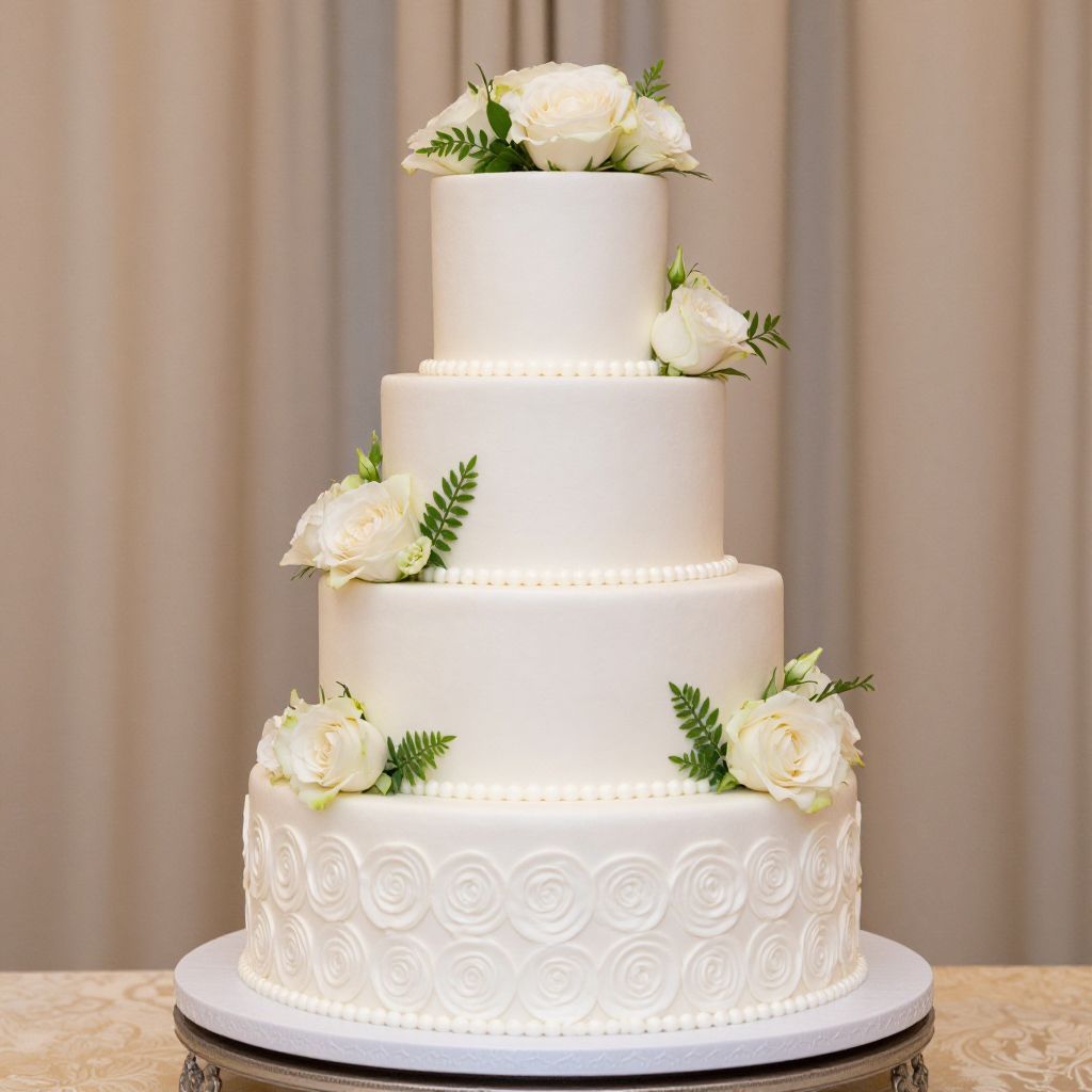 Elegant three-tiered wedding cake featuring smooth white tiers adorned with delicate white roses and green foliage, complemented by a scalloped base decorated with intricate rose patterns, all presented on a circular white platter.