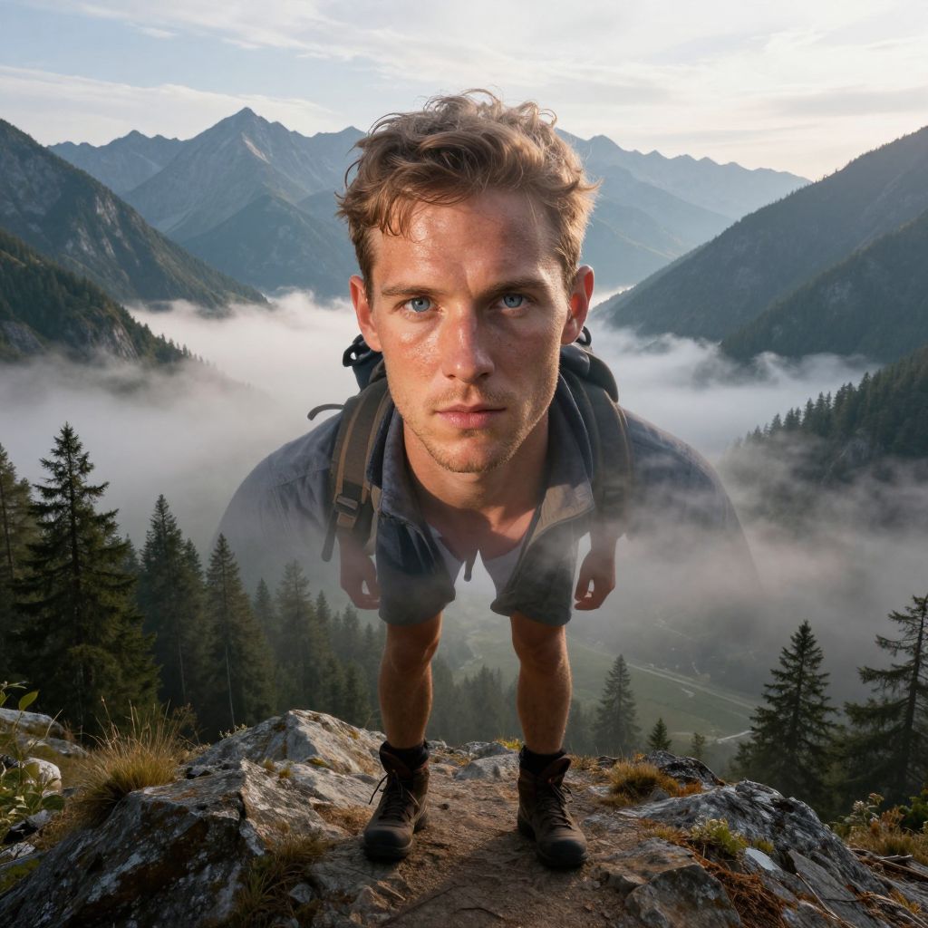 A captivating double exposure portrait showcases an intrepid outdoor adventurer with sun-kissed skin and piercing blue eyes. His determined gaze contrasts sharply against a serene mountain valley backdrop, where majestic peaks soar skyward amidst lush forests. Partially obscured by swirling mists, his silhouette merges seamlessly with the landscape. Bathed in soft golden light, this panoramic vista highlights rugged terrain beneath his boots while misty veils soften his features, creating an harmonious blend of nature's raw beauty and human resilience.