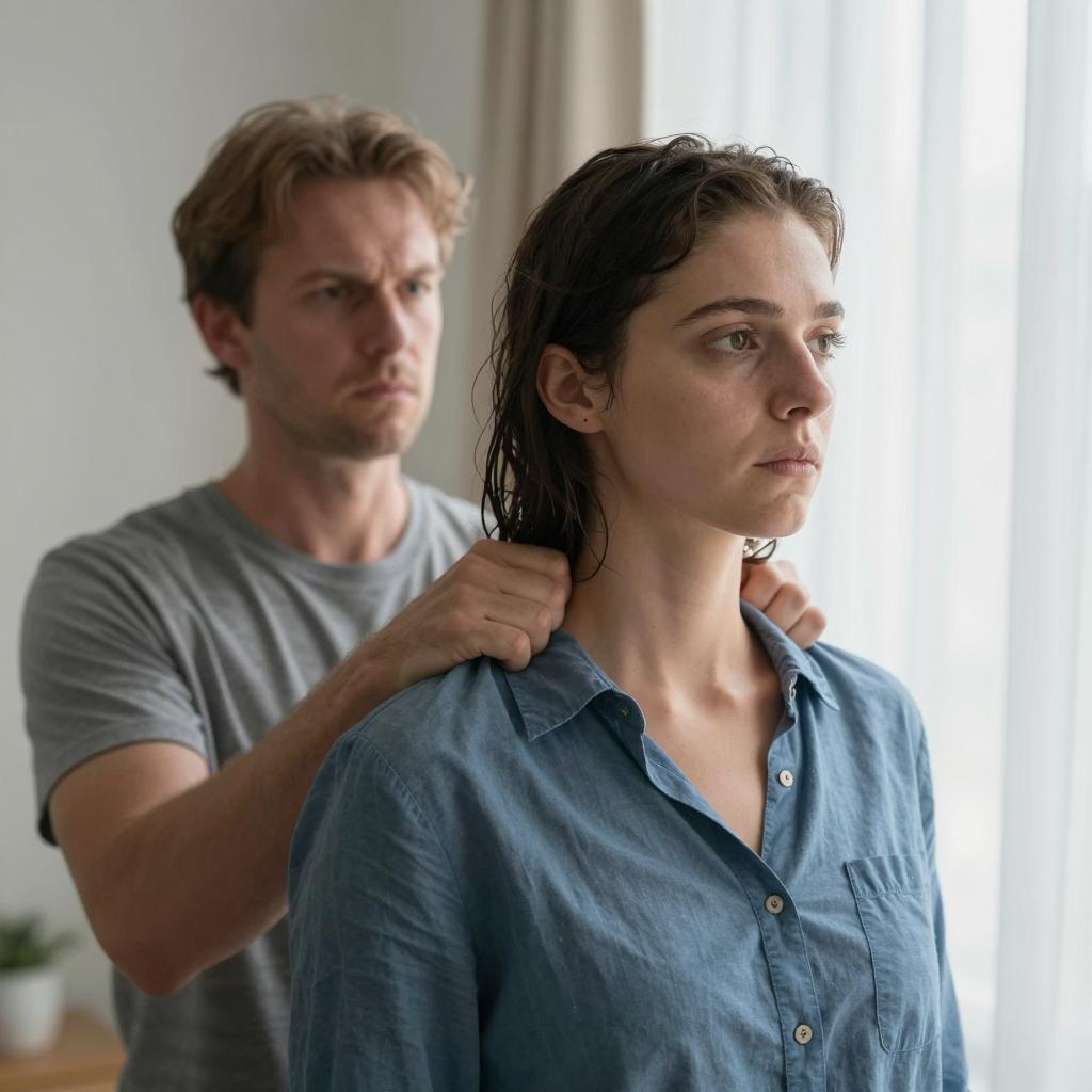 A close-up photograph of a man and a woman in an intimate embrace. The man with gray hair and a beard gently holds the woman's head with both hands, his face close to hers. The woman has brown hair tied back, wearing a black top. Both have intense expressions. The man wears a light blue shirt. The background is blurred with dark and light tones. The man is on the left, the woman on the right.