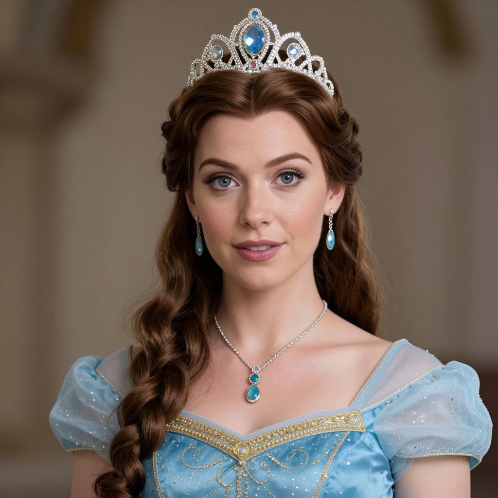 Princess anna costume woman, 1girl, solo, jewelry, long hair, tiara, brown hair, necklace, earrings, braid, blue eyes, dress, looking at viewer