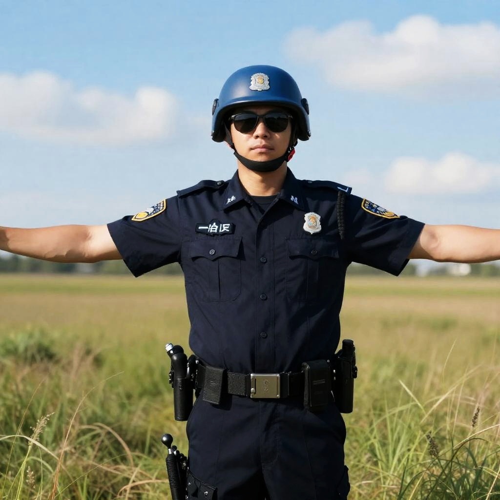 Photograph of a male police officer in a grassy field. He wears a blue helmet with a badge, dark sunglasses, and a navy uniform with a yellow patch. His arms are outstretched. Clear blue sky with scattered clouds in the background. The officer has a light skin tone and a neutral facial expression. Tall grass surrounds him.
