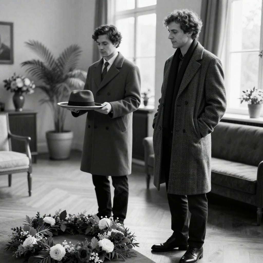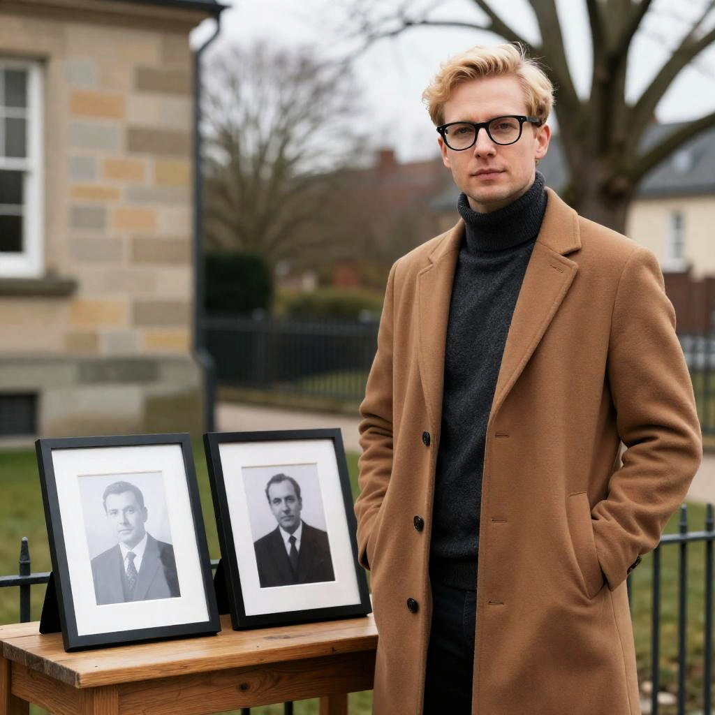 Blonde man with black-framed glasses, wearing brown coat and dark turtleneck, stands beside two framed pictures on a wooden stand. Background: stone building, leafless trees, metal fence, overcast sky. Man's expression is neutral, hands in pockets.
