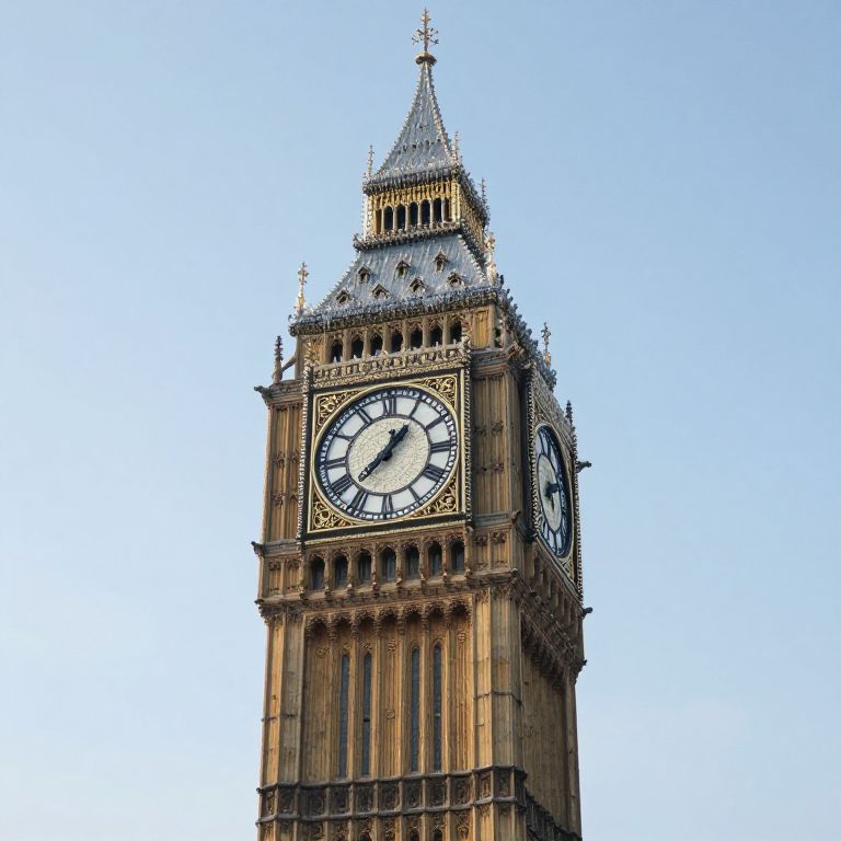 Photograph of the iconic Big Ben clock tower against a clear blue sky, showcasing its detailed Gothic architecture and prominent clock faces.