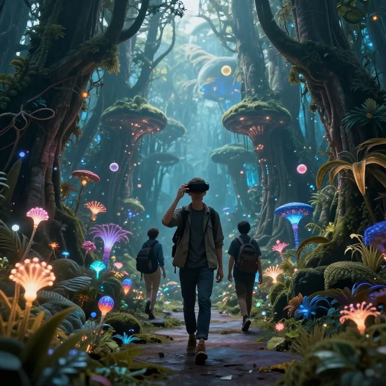Midjourney free virtual reality travel experience where users walk through a serene, hyper-detailed alien forest with bioluminescent plants and floating orbs, immersive and dreamlike ambiance, richly textured natural elements