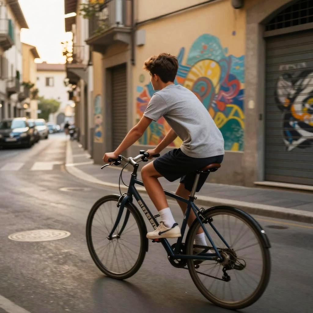 Italian teen boy, dressed in a sporty outfit, riding a bicycle through narrow Italian streets, dynamic motion blur effect, early morning light, authentic urban vibes, colorful murals in the background