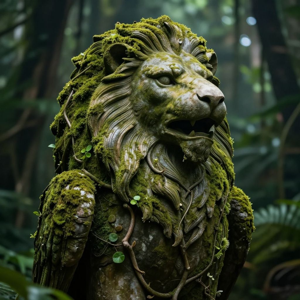 Photograph of a moss-covered, detailed stone lion statue in a lush, dense forest with ferns and tall trees, standing proudly.