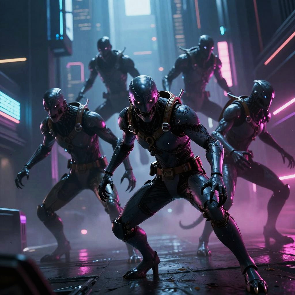 Predators in a futuristic cityscape, blending with neon lights and shadows, cyberpunk aesthetic, sleek and menacing creatures, dynamic composition, dramatic contrast