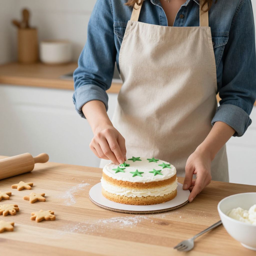 Woman baking in a kitchen, wearing a denim shirt and beige apron, decorating a round cake with green icing stars while preparing cookies on a wooden countertop.