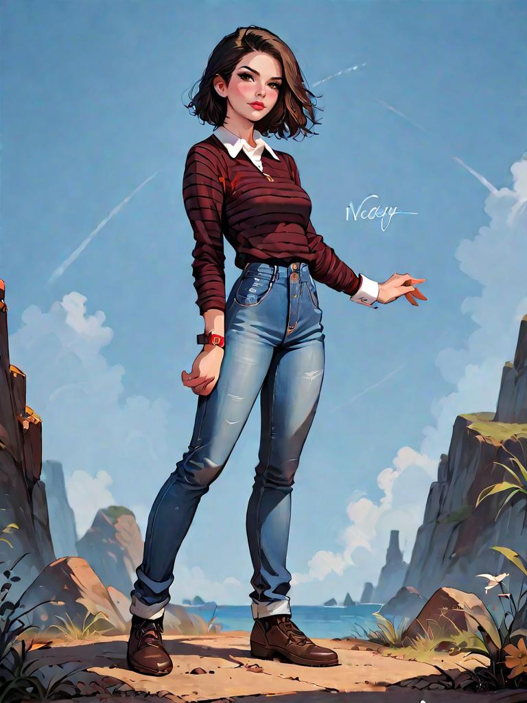 1girl, source_comics, realistic face, full body shot, Woman, casual, maroon and white striped pullover, crew neck, long sleeves, fitted cuffs, paired with dark blue skinny jeans, wristwatch with gold-tone bezel and brown leather strap.