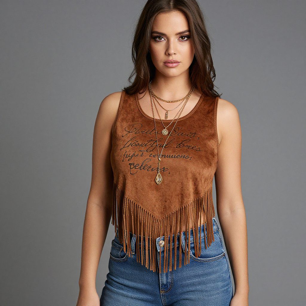 Photograph of a young woman with long, dark brown hair and fair skin, standing against a plain gray background. She wears a sleeveless, brown suede tank top with fringe along the bottom, and intricate cursive text in the center. She pairs it with high-waisted, blue denim jeans. Multiple layered gold necklaces with pendants adorn her neck. Her expression is neutral, and she gazes directly at the camera. The lighting is even, highlighting her features and the textures of her clothing. The overall style is casual yet chic.