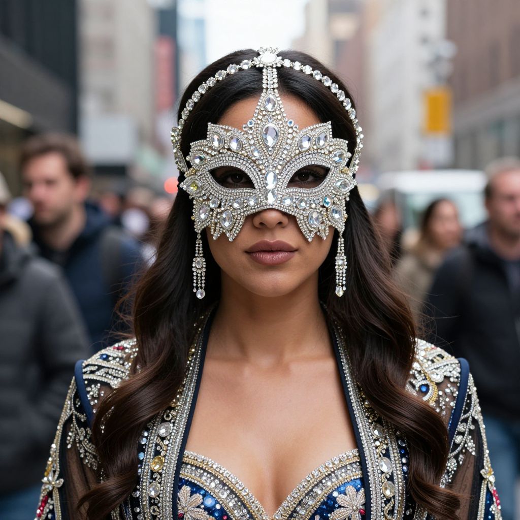 A woman in a luxurious, intricately designed outfit stands on a crowded New York City street, wearing a designer crystal mandala ski mask that covers her full face and a headpiece adorned with fine Swarovski crystals.