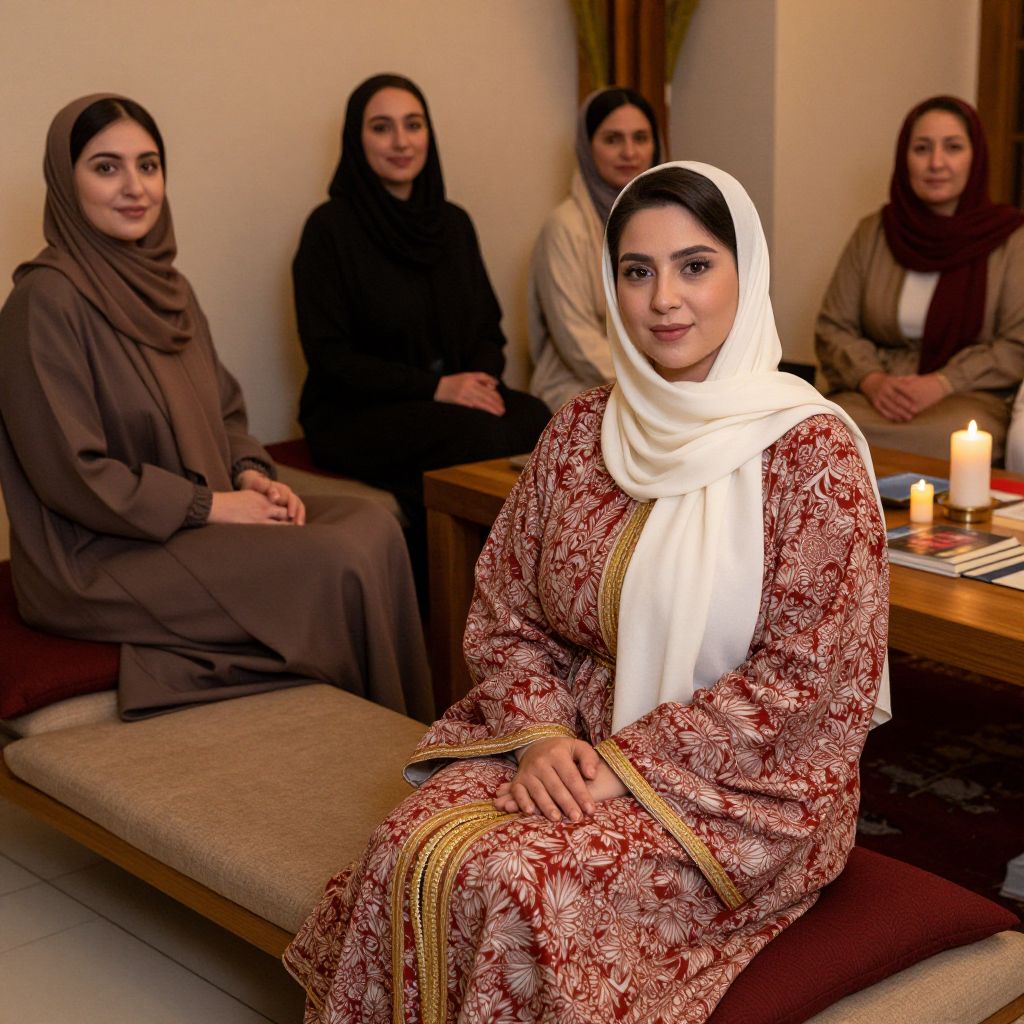 A group of women in a community center in Istanbul gather for a cultural evening, each dressed in traditional modest Islamic clothing, including layered abayas in earthy tones, elegant hijabs, and modest scarves. One woman, with deep brown eyes and a peaceful demeanor, wears a red and white patterned abaya with a gold trim, sitting on a cushioned bench in a warm, cozy room with books and candles on a wooden table.. The woman has big tits and cute face