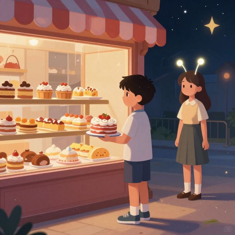 A surreal illustration depicts a boy holding a cake, standing in front of a store window filled with pastries, with a girl with glowing antennae nearby, set against a night sky.