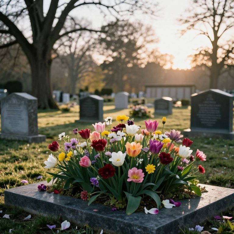 Photograph of a sunlit cemetery at sunset, featuring a vibrant floral arrangement of pink, yellow, white, and red tulips with green leaves, placed on a grey granite tombstone in the foreground. The background shows numerous gravestones of varying sizes and styles, silhouetted against a glowing, sunlit sky with bare trees. The grass is green with scattered flower petals. The sunlight creates a warm, golden glow, highlighting the colorful flowers and casting shadows of the trees. The overall scene evokes a serene and respectful atmosphere.