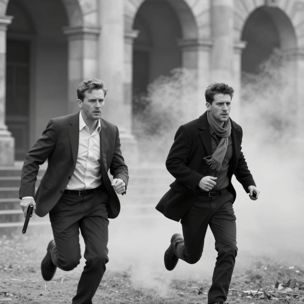 Black-and-white photo of two Caucasian men in formal attire running away from a smoky building with stone columns. The man on the left wears a dark suit and light shirt, holding a pistol with a determined expression. The man on the right wears a dark coat and a light scarf, holding a small object with an intense expression. Both men are mid-stride in an outdoor setting with smoke surrounding them.