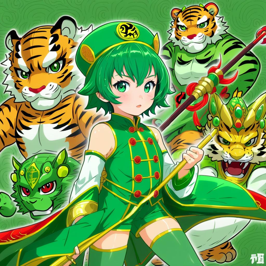 Digital anime-style illustration featuring a young girl with green hair and eyes dressed in traditional Chinese clothing, including a green and gold outfit with detached sleeves, thigh-high socks, and a hat. She holds a staff and is surrounded by anthropomorphic tiger characters and dragon motifs, blending fantasy and superhero costume elements.